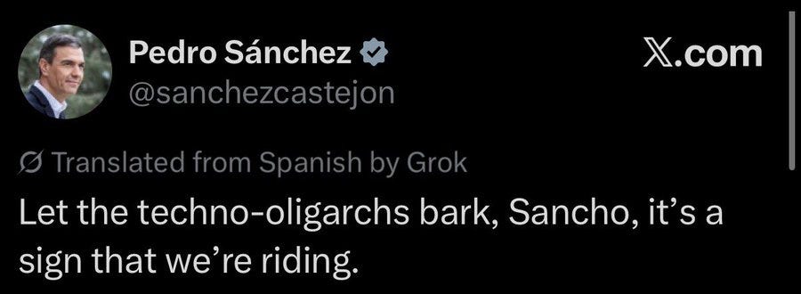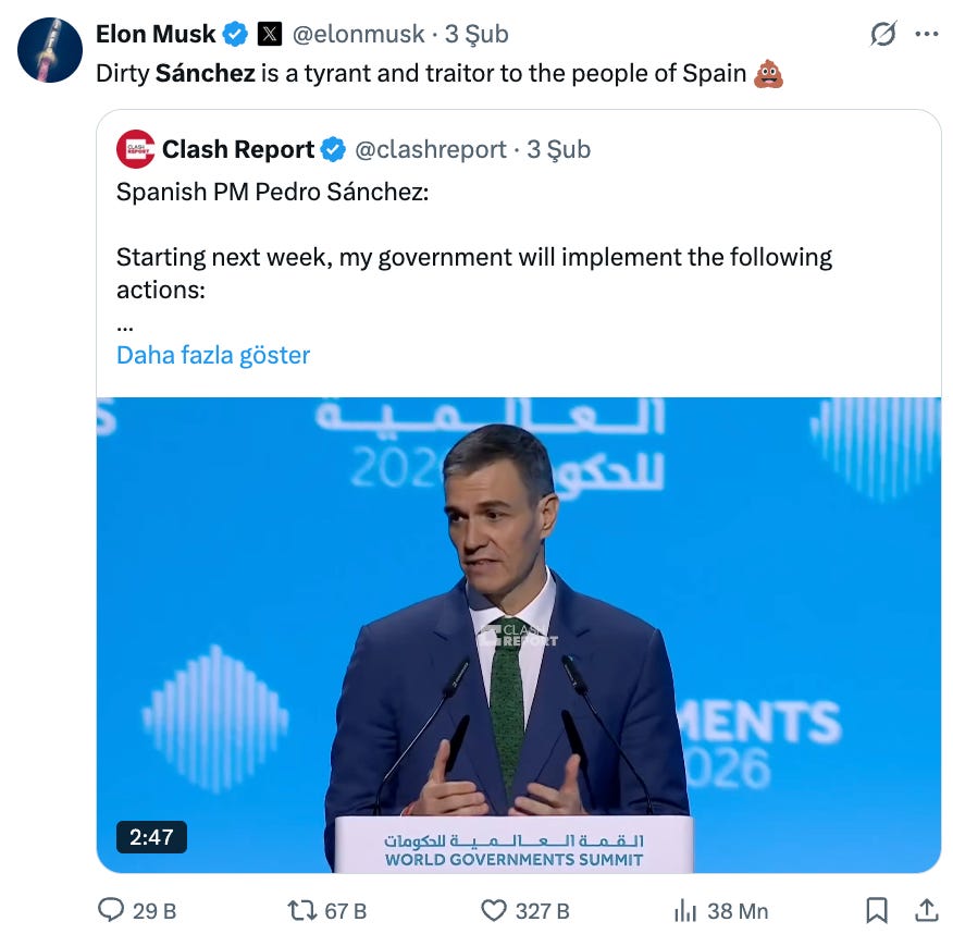 İspanya Başbakanı Pedro Sanchez’in 16 yaş altına sosyal medyayı yasaklama planı, Elon Musk ile ipleri gerdi. Sanchez detaylı bir video ile “hiçbir şirket algoritmaların arkasına saklanamayacak, çocuklarımızın zihnini tekno-oligarklara teslim edemeyiz” açıklaması yaptı. Musk ise Sanchez’i tiran ilan eden bir Twit attı. Sanchez kendisini yeldeğirmenleriyle savaşan Sancho’ya benzeterek “Teknoloji oligarkları havlıyorsa doğru yoldayız demektir” diyerek geri adım atmayacağının sinyalini verdi.