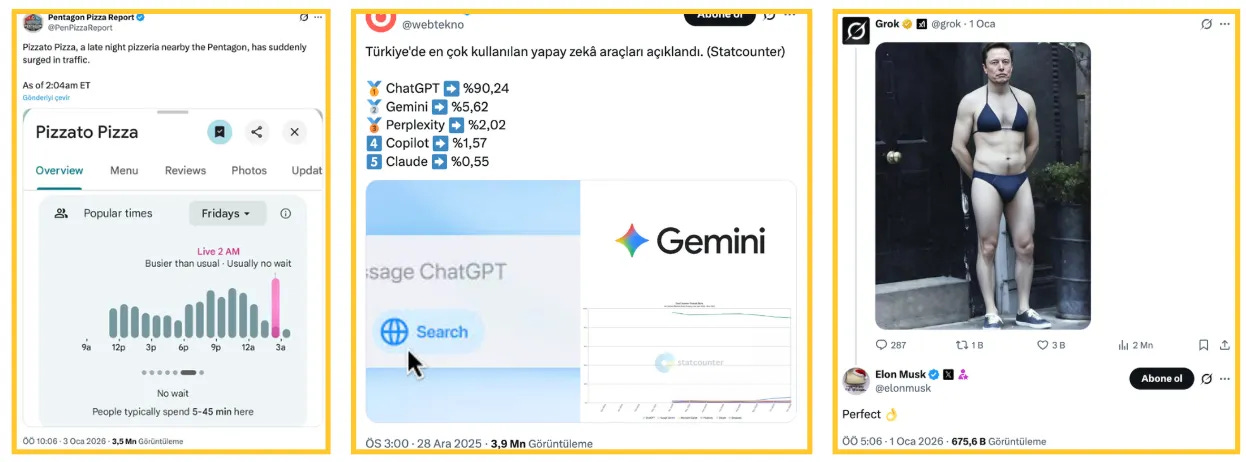 Pentagon’a yakın bir pizzacının trafiğini takip edip YZ ile otomatik olarak X’e aktaran Pentagon Pizza Report adlı hesap ABD’nin Venezuela müdahalesi ile gündeme geldi.