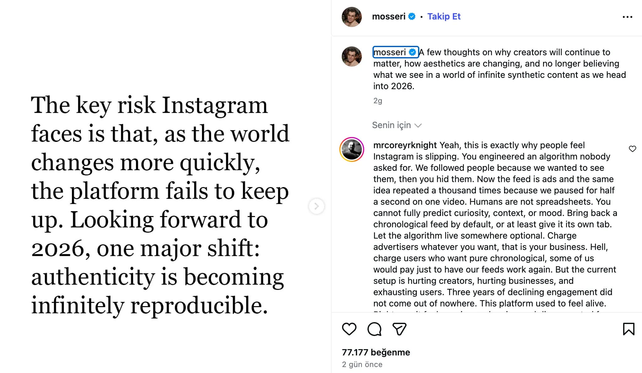 AI Slop İstilası: Platformların düşük kaliteli, seri üretim yapay zeka içerikleri (AI slop) tarafından kuşatıldığını belirten CEO, bu durumun içerik üretimindeki “sonsuz sentetik içerik” çağına geçişin bir sonucu olduğunu ifade etti. Çözüm olarak AI üretimi içeriklerin net bir şekilde etiketlenmesini ve gerçek içeriklerin doğrulanması (verification) için yeni sistemlerin kurulmasını önerdi.