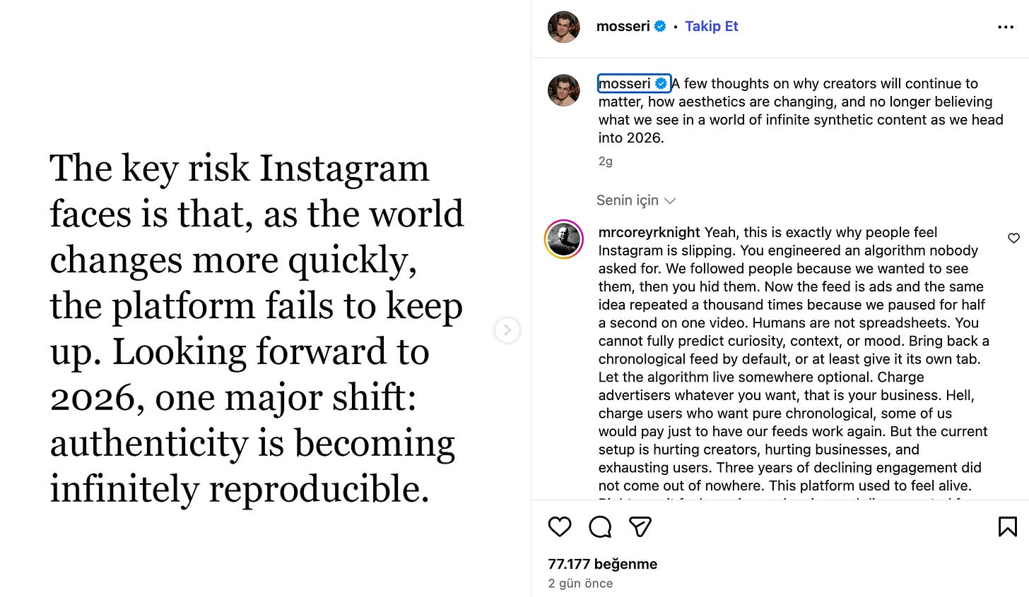 Instagram’ın başındaki isim Adam Mosseri, yapay zekanın sosyal medya ekosistemini sürüklediği yeni aşama hakkında sarsıcı bir “gerçeklik uyarısı” yayınladı. Mosseri’ye göre, dijital dünyada görsellerin varsayılan olarak “gerçek” kabul edildiği dönem resmen kapandı.