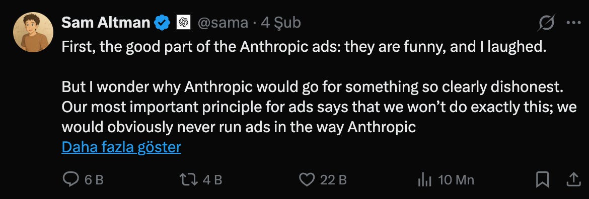 Anthropic’in reklamı tek başına bir meydan okumaydı. Ama Altman’ın yanıtı o meydan okumayı iki taraflı bir savaşa dönüştürdü. Öyle ki bu tepki, Anthropic’in Super Bowl’un kazananı olduğu yorumlarına bile sebep oldu.