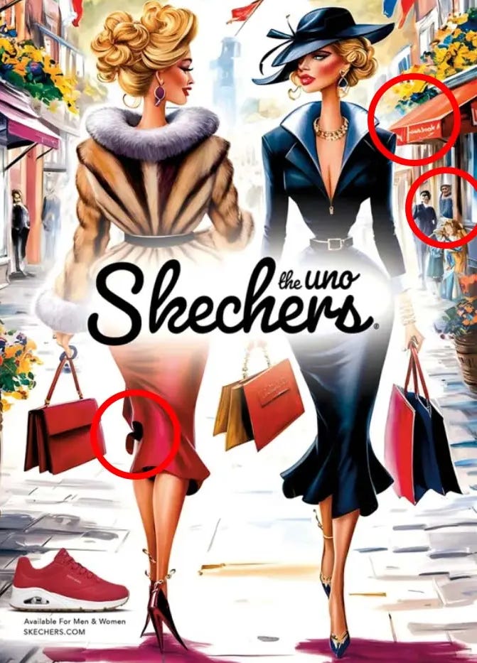 Skechers Vogue dergisin Aralık ayında tam sayfa olarak verdiği reklamda yapay zekâyı kullandı. Kullanması ciddi bir sorun değil ama savsaklığı sorun. Reklamda yapay zekâ ile üretilmesinden kaynaklı bulanık yüzler, okunamayan metinler ve kopan bir elbise gibi özensizlikler var. İnternette reklamla ile ilgili bolca yorum var. İş markadan nefret etme noktasına kadar gelmiş. Anlaşılan Dall-e’ye promptları ajans başkanının çocuğu yazmış :)