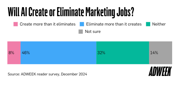 AdWeek, 350 okuruna yapay zekâ teknolojileri ile ilgili çeşitli sorular sordu. Ankette katılımcılar, %46’sı yapay zekânın pazarlamada daha fazla işi ortadan kaldıracağını düşünürken, yalnızca %8’i daha fazla iş yaratacağına inanıyor. Buna rağmen, %67 gibi büyük bir çoğunluk yapay zekânın kendi işlerini tehdit etmediğini belirtiyor. Konunun özeti sektör yapay zekânın yaratacağı etkinin farkında ancak çoğunluğun kendine güveni tam. Ben değil başkaları işsiz kalır diyor. :)