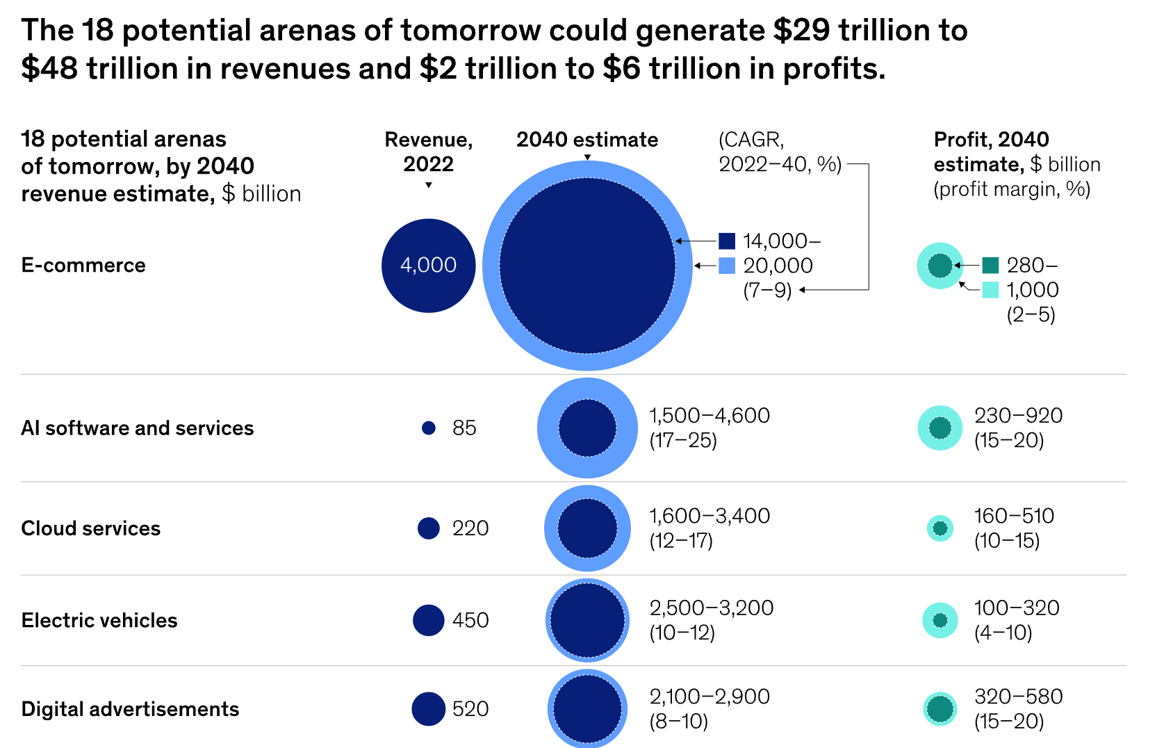 2024’ün son bültenine gelecek öngörüleri ile başlamak istedik. McKinsey’in “Bir sonraki rekabet arenaları” raporu ile bugünden 2040’a doğru bakacağız. McKinsey’in büyüme potansiyeli gördüğü 18 sektörün ilk beşi hemen aşağıda. Zirvede e-ticaret var. 2040’ta da zirvede olacak. Yapay zekâ yazılım ve servisleri büyük patlama yapacak sektör gibi gözüküyor. Bulut hizmetleri, elektrikli araçlar ve dijital reklamlar listenin diğer büyüyecek sektörleri. Reklamcıların genelini bilmiyorum ama dijitalciler aç kalmayacak gibi gözüküyor. 🤣
