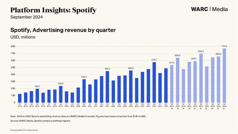 Spotify, reklam konusunda son altı çeyrektir çift haneli büyüme yakaladı. WARC'nin yaptığı araştırmaya göre, Spotify'ın küresel reklam gelirinin 2024'te 2,1 milyar dolara ulaşması bekleniyor. Bu büyümeye, reklam gelirlerinin önümüzdeki yıllarda da artmaya devam edeceğini gösteriyor. Spotify'ın reklam gelirlerindeki artış, markaların sesli platformlara yönelik artan ilgisini de göstermesi açısından önemli bir veri.