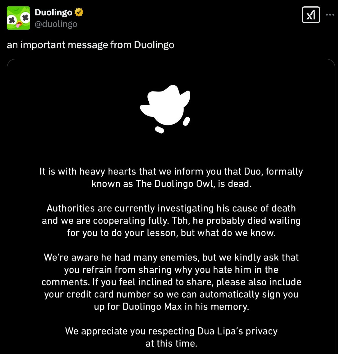 Tüm paylaşımlar gösteriyor ki Duolingo’nun bu kampanyası henüz sona ermiş değil. Duo’nun ölümü, markanın stratejik bir hamlesi olarak uzun süre konuşulacak gibi görünüyor.