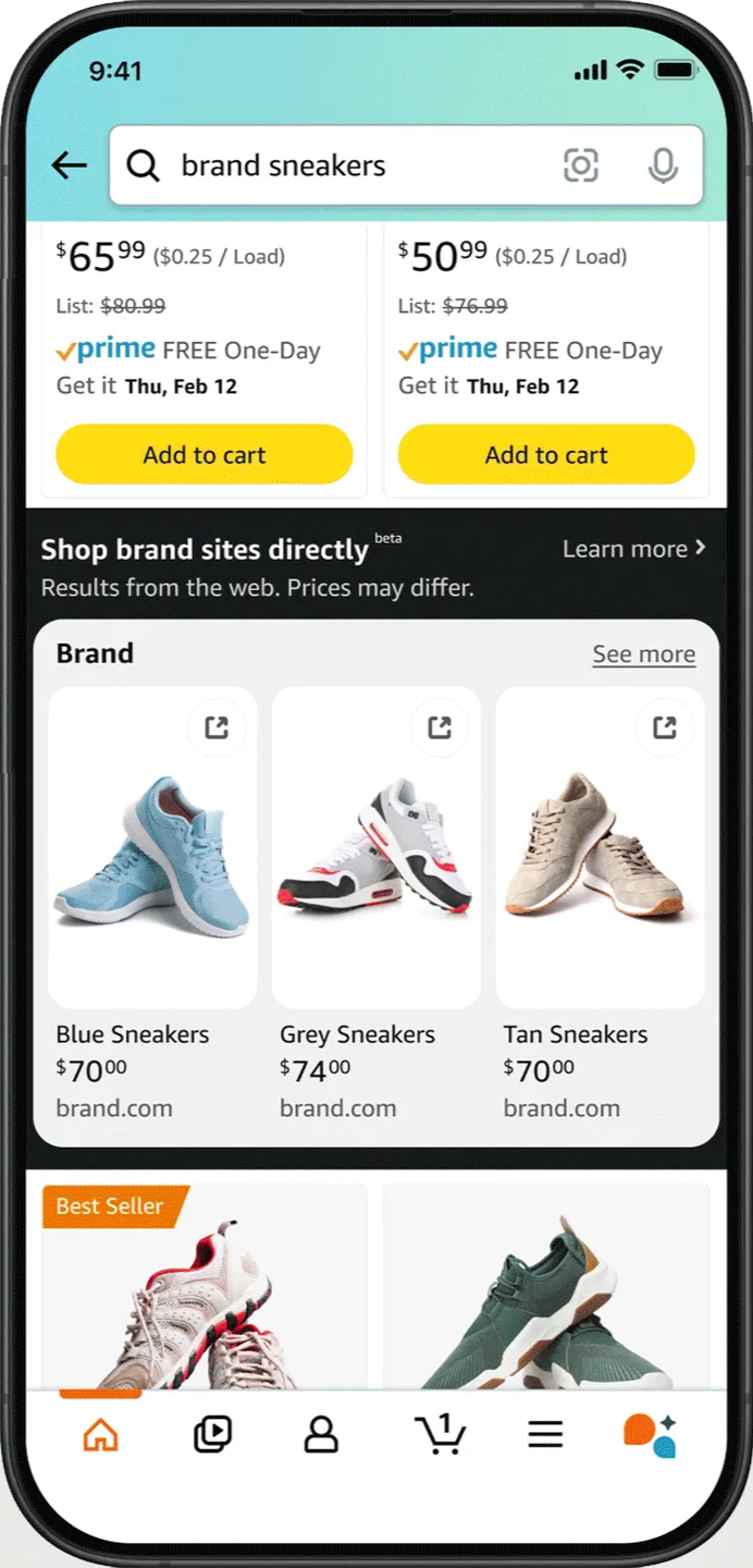 Amazon Shopping uygulamasında arama yapan müşterileri, kendi stoklarında bulundurmadığı ürünler için doğrudan markaların web sitelerine yönlendiren bir özelliği test ediyor. Amazon’da gösterilen bu ürünlerin bilgileri ise düzenli olarak markaların web sitelerinden güncellenecek. Bu uygulamanın Amazon’a nasıl bir fayda sağlayacağı komisyon alıp almayacağı konusunda bir açıklama yok. Fakat "Buy With Prime" (örneğin ücretsiz kargo) seçeneğinin buradaki alışverişler için de geçerli olduğu açıklandı.
