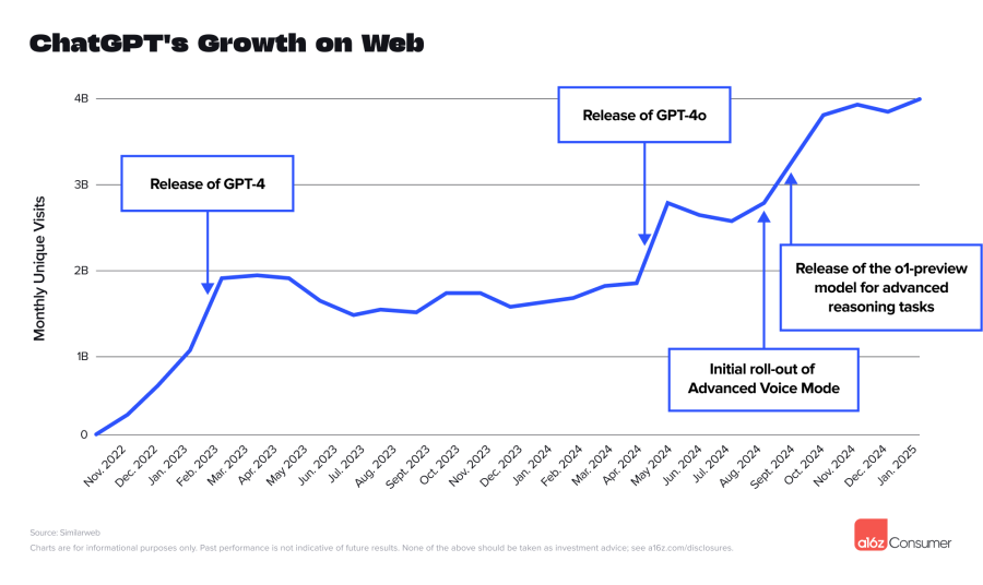 ChatGPT, 2024'ün ikinci yarısında güçlü bir büyüme göstererek haftalık aktif kullanıcı sayısını altı ay içinde iki katına çıkardı. 2023 Kasım'da 100 milyon haftalık aktif kullanıcıya ulaşan uygulama, 2024 Aralık’da 300 milyona ve 2025 Şubat’ta ise 400 milyona ulaştı. Mobil uygulama kullanıcıları da her ay %5 ila %15 oranında artış gösterdi. ABD’nin en önemli yatırım firmalarından olan a16z tarafından yayınlanan bu raporun tamamına şuradan ulaşabilirsiniz.