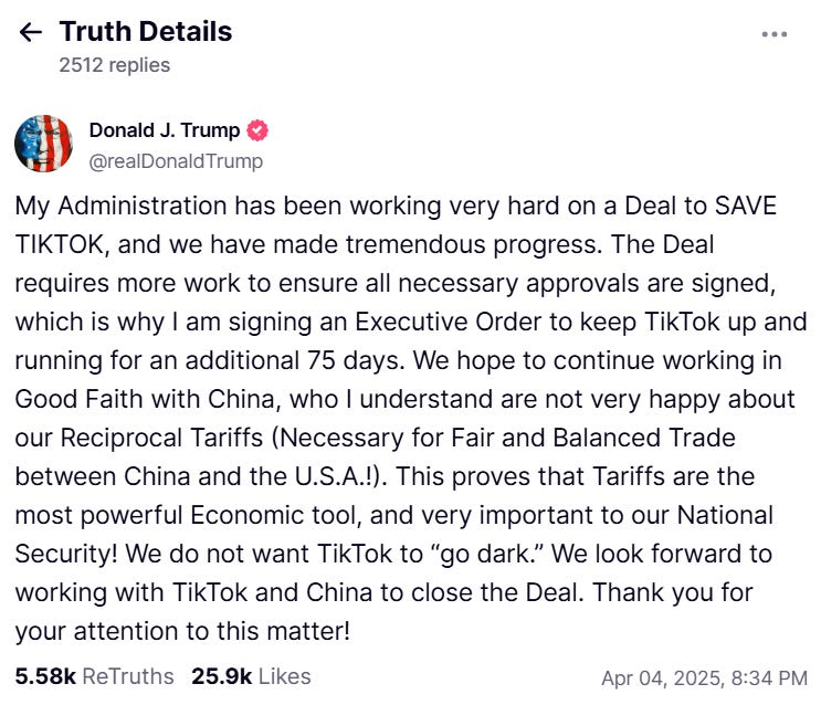 Evet bunlar TikTok için çalan zilin sesi. Trump göreve geldiği gün, TikTok yasağının uygulanmasını 5 Nisan'a kadar uzatmıştı. Ama bu tarihe kadar net bir alıcı çıkmadığı için Trump süreyi 75 gün daha uzatan kararname yayınladı. Sanırım kapalı kapılar ardında görüşmeler devam edecek. 75 gün içinde bu iş çözülebilecek mi? Sanırım bir uzatma daha gelir.