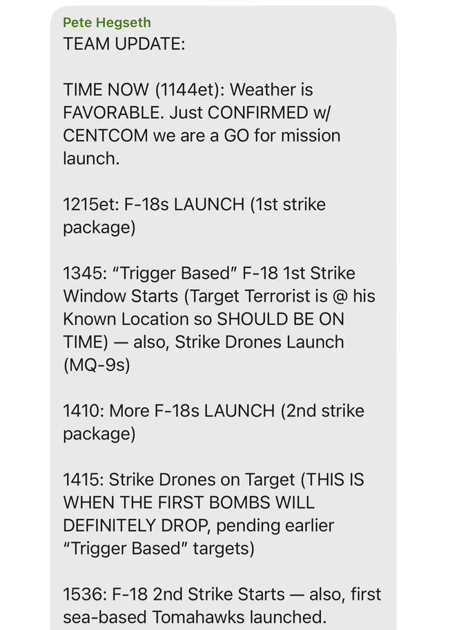 Goldberg'in yayınladığı belgelere göre, Savunma Bakanı Pete Hegseth'in zamanlama ve kullanılacak silahlar da dahil olmak üzere Yemen'deki Husi hedeflerini vurmaya yönelik ayrıntılı planları bu grupta paylaşmış.
