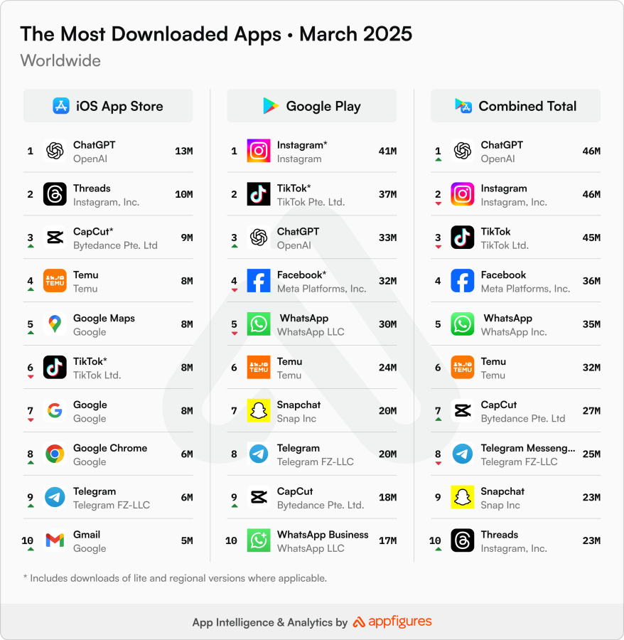 ChatGPT, Mart ayında en çok indirilen uygulama oldu ve Instagram ve TikTok gibi rakiplerini geride bıraktı. Geçtiğimiz hafta da yazdığımız görüntü oluşturma aracı ile ChatGPT uygulaması adeta roketledi. Mart ayında 46 milyon yeni indirme ile toplam indirmeleri %28 arttı. Birinciliği korumak için yeni özellikler eklenir mi ya da bu kadar yoğun kullanıma ChatGPT sunucuları dayanabilir mi merak ediyorum.