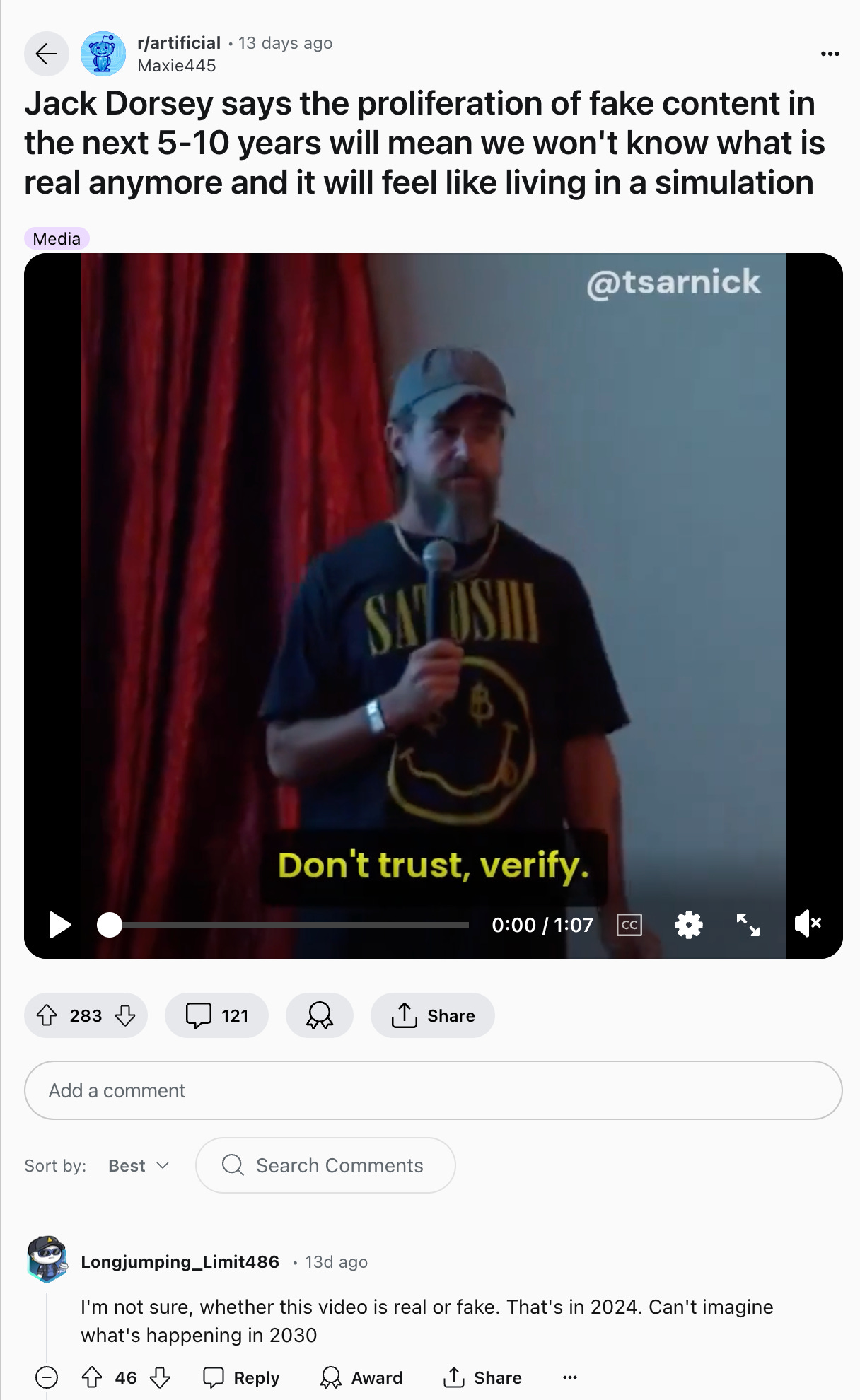 Jack Dorsey, Twitter'in kurucusu, önümüzdeki 5-10 yılda sahte içeriğin yayılması nedeniyle gerçek ve sahte arasındaki farkı ayırt edemeyeceğimiz bir durum olacağını ve bu durumun bir simülasyon gibi hissedileceğini belirtti. Çok haklı. İlgili Reddit paylaşımındaki kullanıcı yorumu her şeyin özeti gibi: “Bu videonun gerçek mi sahte mi olduğundan emin değilim. Bu 2024'te. 2030'da neler olacağını hayal edemiyorum.”
