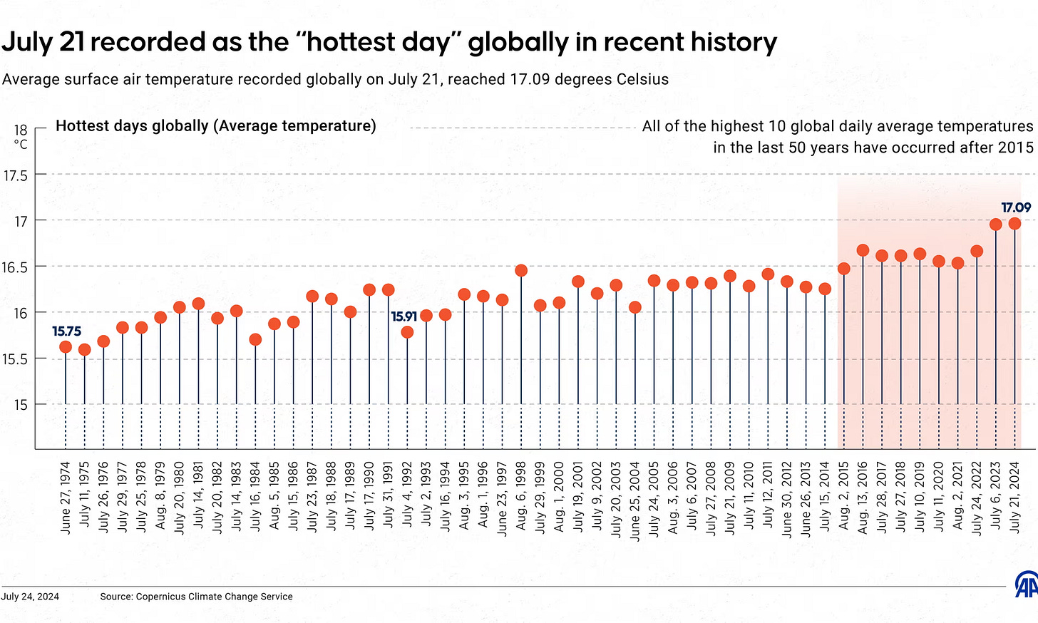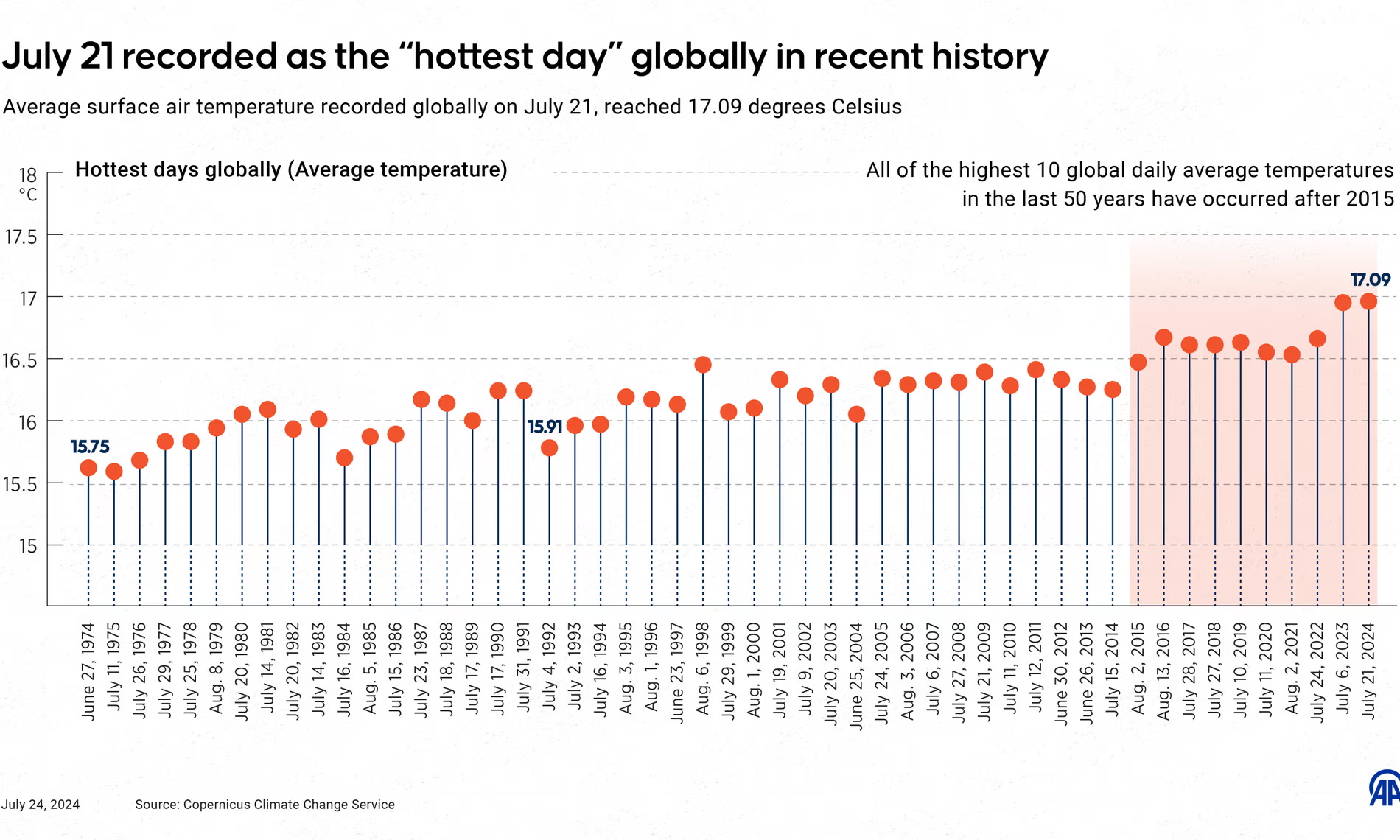 1940 yılına kadar uzanan verileri tutan Copernicus İklim Değişikliği Servisi tarafından yayınlanan geçici veriler, küresel yüzey hava sıcaklığının ortalama 17,15 santigrat dereceye ulaşarak rekor kırdığını gösteriyor. Dünya'nın en sıcak günü rekoru, 21 Temmuz'da 17,09°C ile kırıldı, ardından 22 Temmuz'da bu rekor 17.16°C'ye yükseldi.