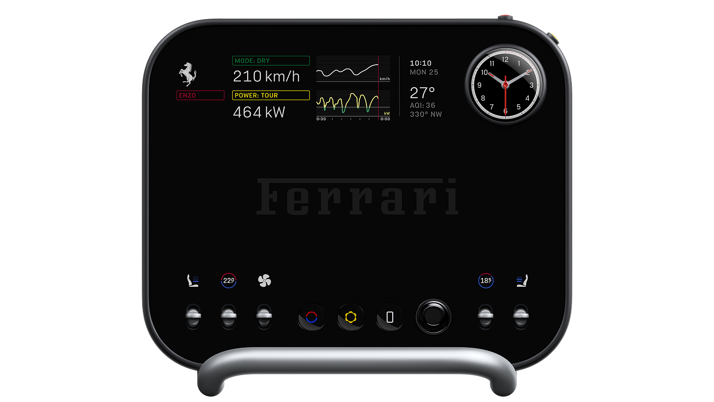 Tamamen dokunmatik bir yapı yerine, Ferrari kullanıcısının etkileşim kurmaktan hoşlanacağı fiziksel düğmeler, çevirilebilen kontroller ve hareket eden ekran ön plana çıkıyor.