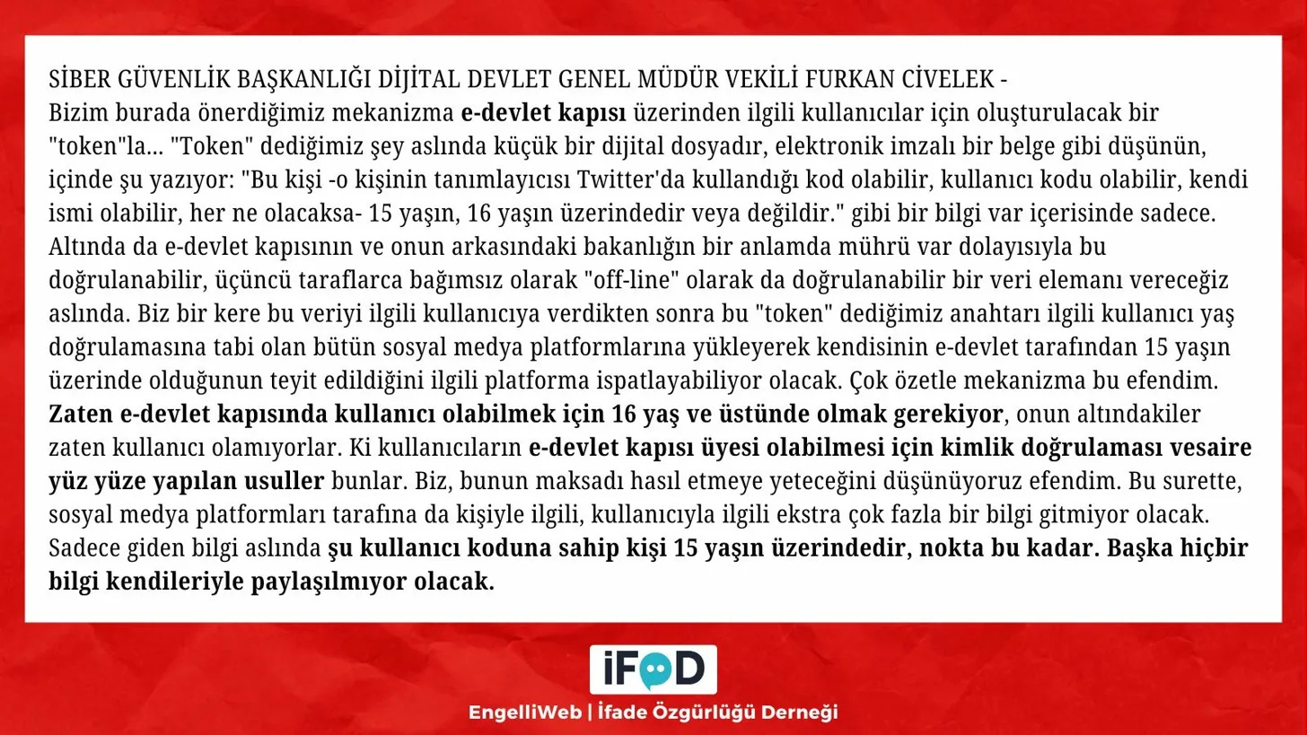 “Bizim burada önerdiğimiz mekanizma e-devlet kapısı üzerinden ilgili kullanıcılar için oluşturulacak bir ‘token’la... ‘Token’ dediğimiz şey aslında küçük bir dijital dosyadır, elektronik imzalı bir belge gibi düşünün. Sadece giden bilgi şu: bu kullanıcı koduna sahip kişi 15 yaşın üzerindedir, nokta, bu kadar. Başka hiçbir bilgi kendileriyle paylaşılmıyor olacak.” — Furkan Civelek, Siber Güvenlik Başkanlığı