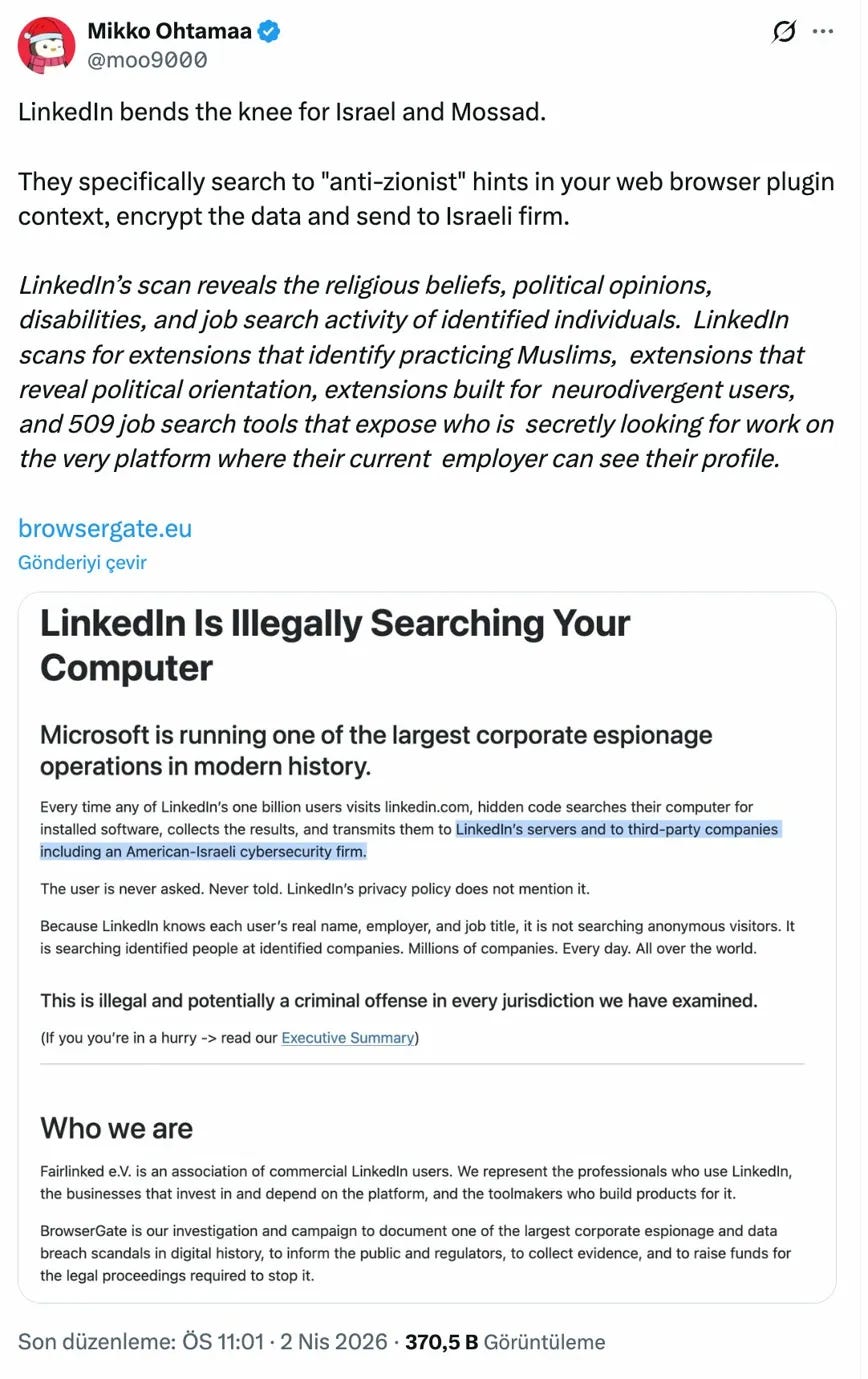 Daha iki gün önce, Linkedin’in İsrail karşıtı hesapları Mossad’a raporladığına dair haberler düştü. Olası mı? Evet. Nasıl korunacağız bu risklerden? Belirsiz.