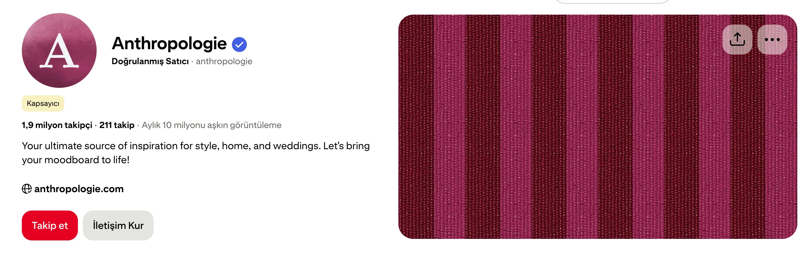 Pinterest bir keşif motoru gibi çalışıyor. Başlık, açıklama ve alt metinlerde doğru anahtar kelime kullanmak pinin görünürlüğünü belirgin artırıyor. Global pazarda kumaş satmaktan organik bala bir çok kategori için iyi çalışıyor.