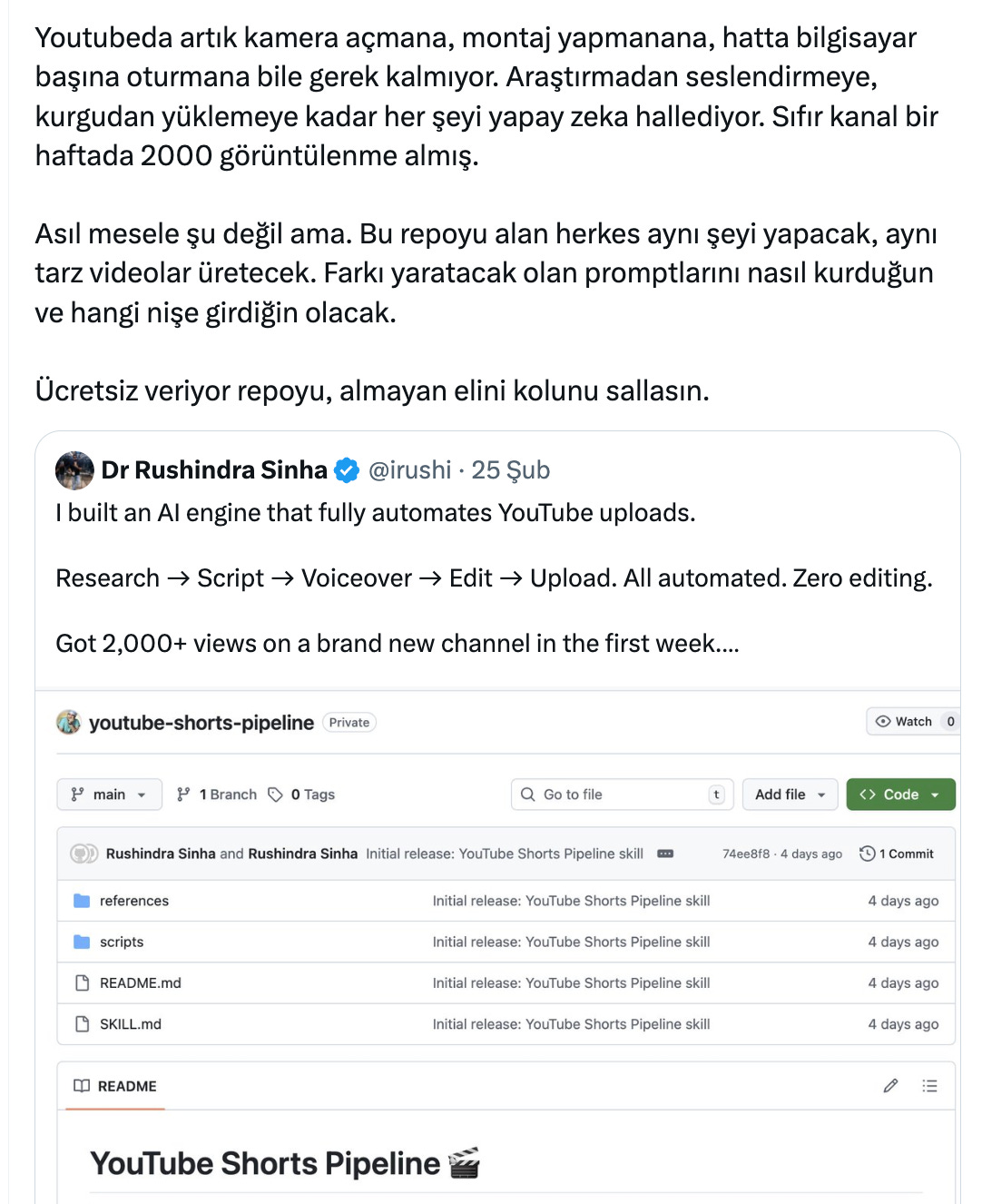 Her gün X’de işlerini yapay zeka ile otomatize eden girişimciler, pazarlamacılar, vibe coderlar, uzmanlar görüyorum. İşler kendi kendine yapılıyor, kodlar yazılıyor, pipeline’lar kurularak paylaşımlar yapılıyor.
