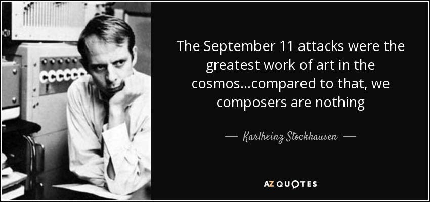 Lentricchia ve McAuliffe’ye göre Stockhausen tarihsel bir gerçeğe istemeden de olsa parmak basmıştı: Politik aşırılık ile avangard sanat, son iki yüzyıldır birbirini besliyor. Şiddet estetize edildiğinde, estetik şiddeti meşrulaştırabiliyor.