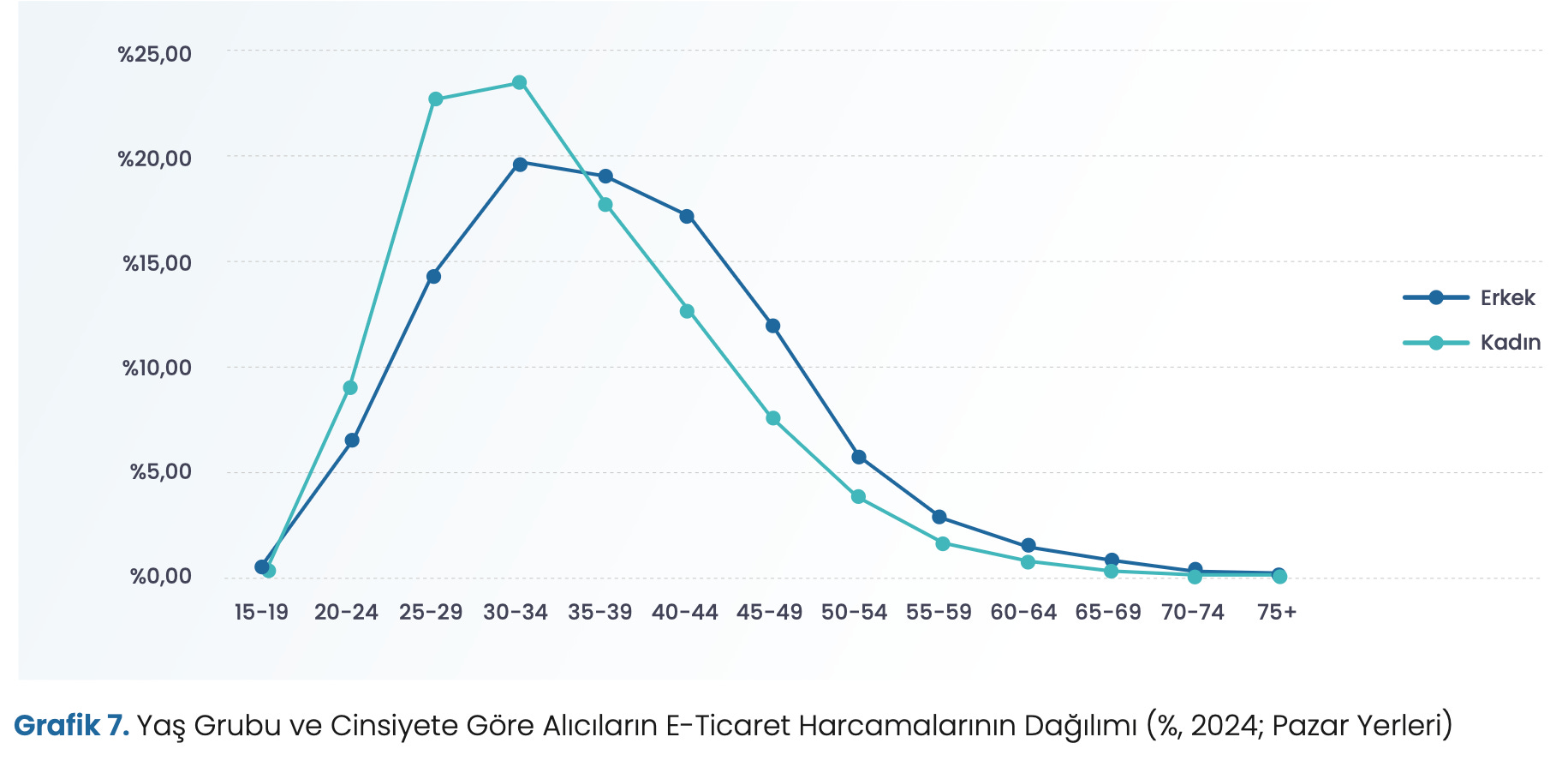 ikas’ın 2025 e-ticaret raporunda en yüksek harcama yapan yaş grubu 30-35 yaş. Ticaret Bakanlığı’nın raporuna göre ise 25-34 yaş en yüksek paya sahip, toplamda 25-44 yaş aralığı sektörün en güçlü tüketici segmenti. Üstelik kadın-erkek fark etmeksizin.